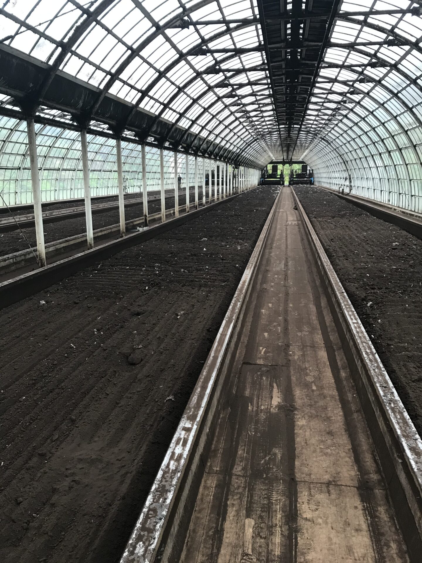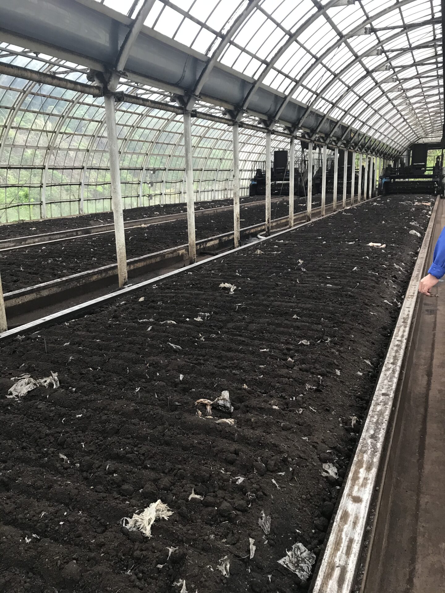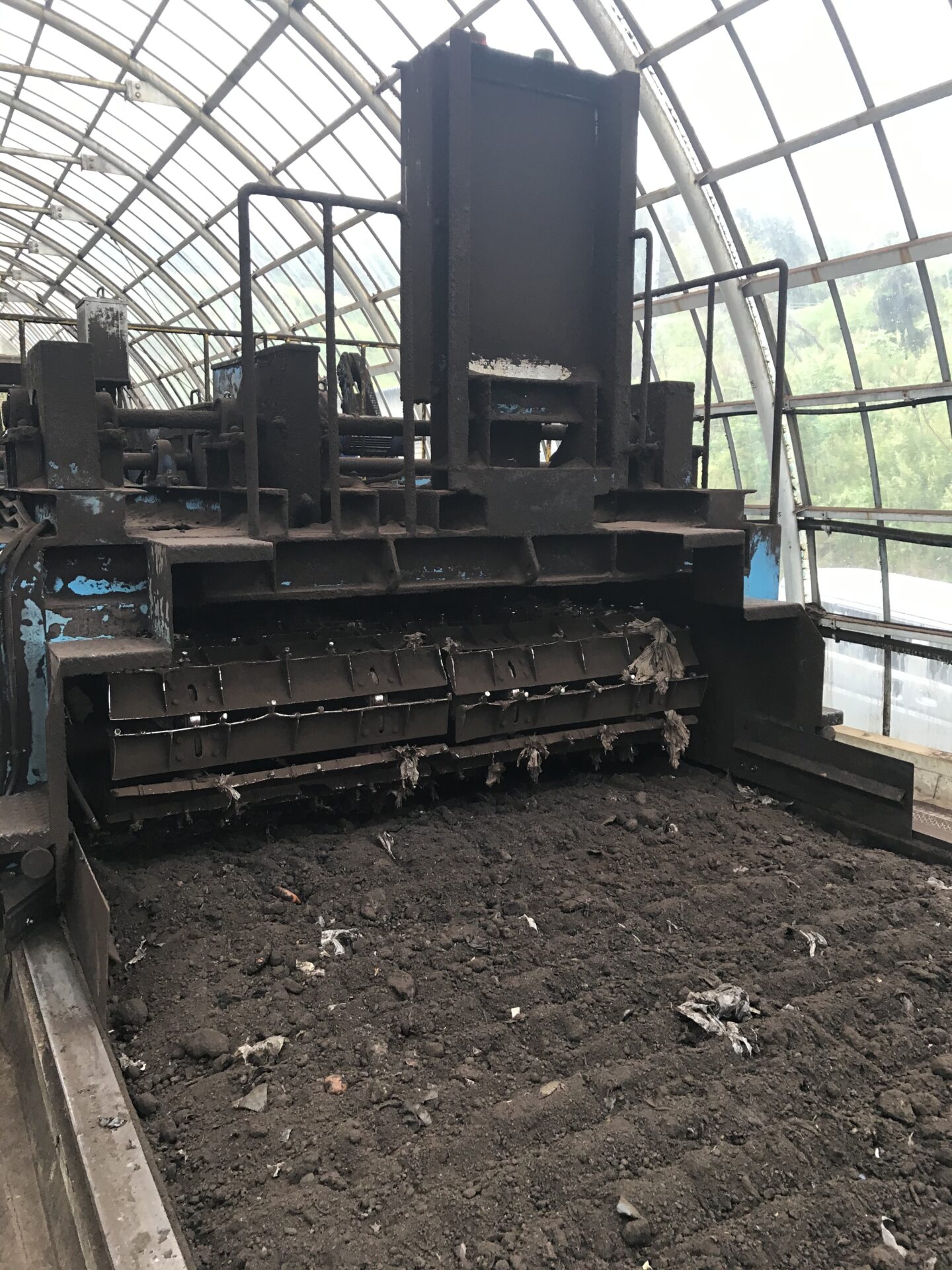 •初期段階の投入口に比べて、施設後方は生分解性ポリ袋、食品残渣は微生物によって分解され、きれいな土壌が広がっている。