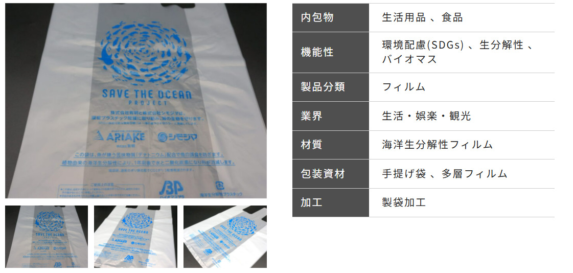 当社では、植物由来の生分解性樹脂コンパウンド、魚が苦みを感じる成分「安息香酸デナトニウム」を使用した海洋生分解性ポリ袋を提案させていただきました。